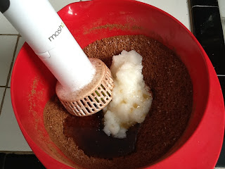 Mix the first five ingredients in a bowl (the dry ingredients). Use the Masha to mix the dry ingredients – I was going to use a whisk because the ingredients were dry and I thought the Masha would send them flying all over the kitchen. Nope.